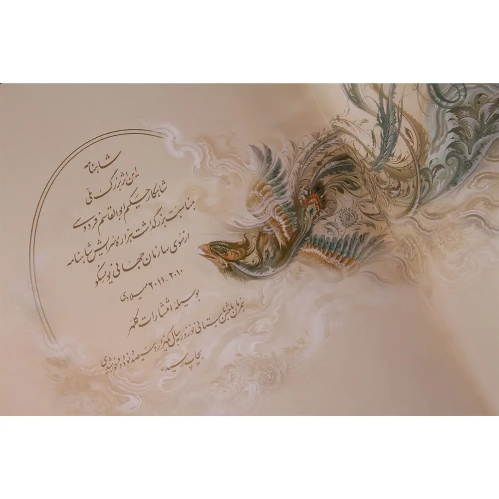 شاهنامه نفيس-يونسكو-2زبانه-رحلی با جعبه چرم طبيعي ويژه بر اساس نسخه ي مسكو به خط استادرسول مرادي و مقدمه ي دكتر محمد علي ندوشن نوشته شده است.